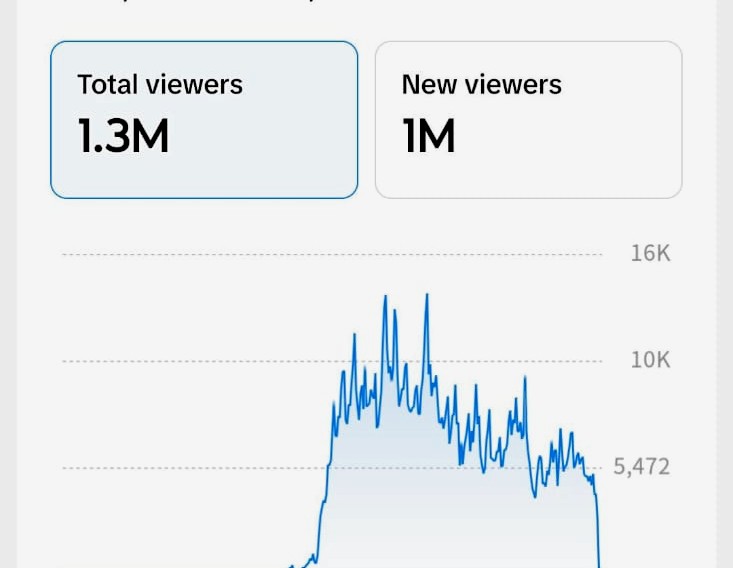 I drove 1.3 million total viewers to the content. Brought in 1 million new viewers who had never engaged before. The growth chart shows consistent peaks hitting over 16K daily views. The strategy proved that smart content decisions create exponential reach.