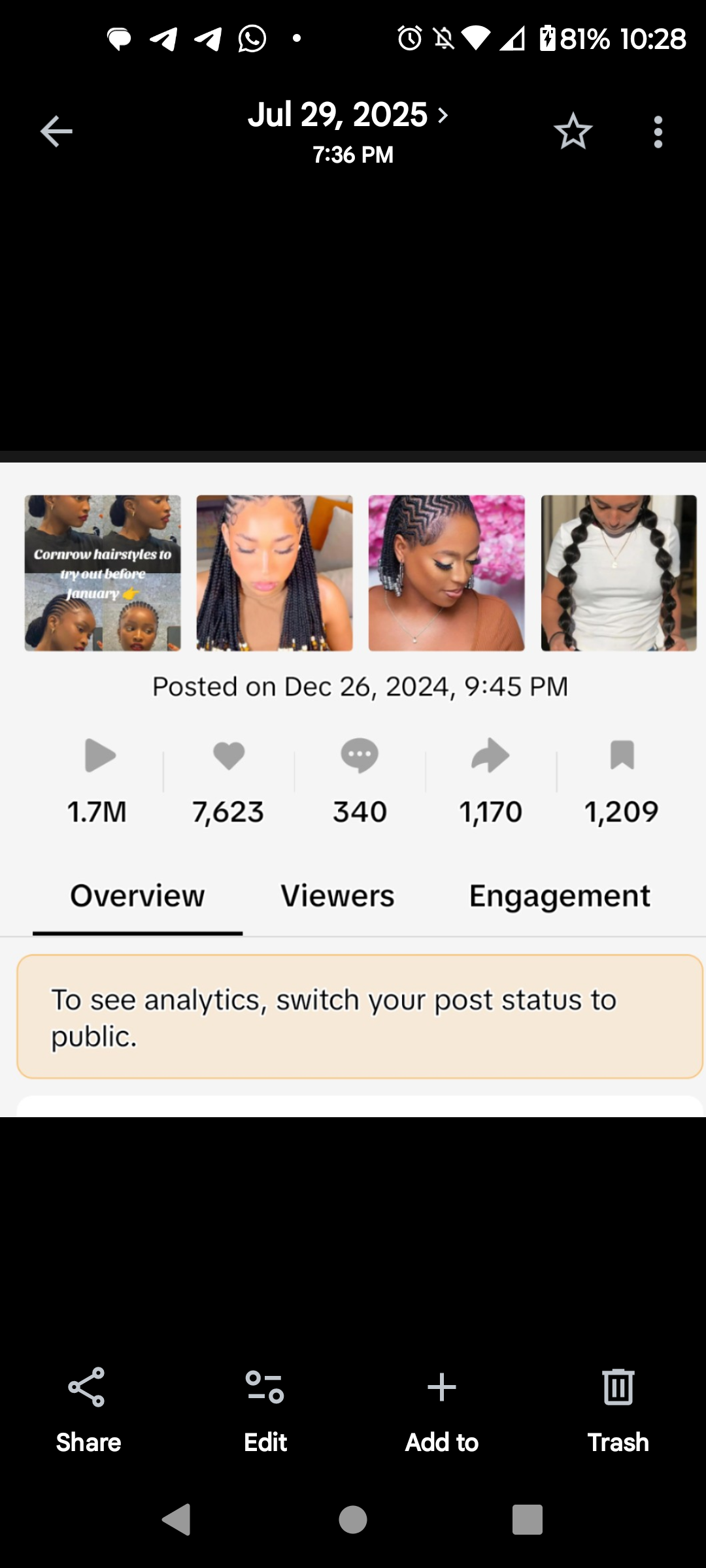 I curated a carousel of stunning cornrow hairstyles with a clear call to action. Used high quality images that showcased different angles and styles. Posted at optimal timing and crafted messaging that invited people to engage before a specific date. I focused on authenticity over perfection, showing real beauty that viewers could connect with.