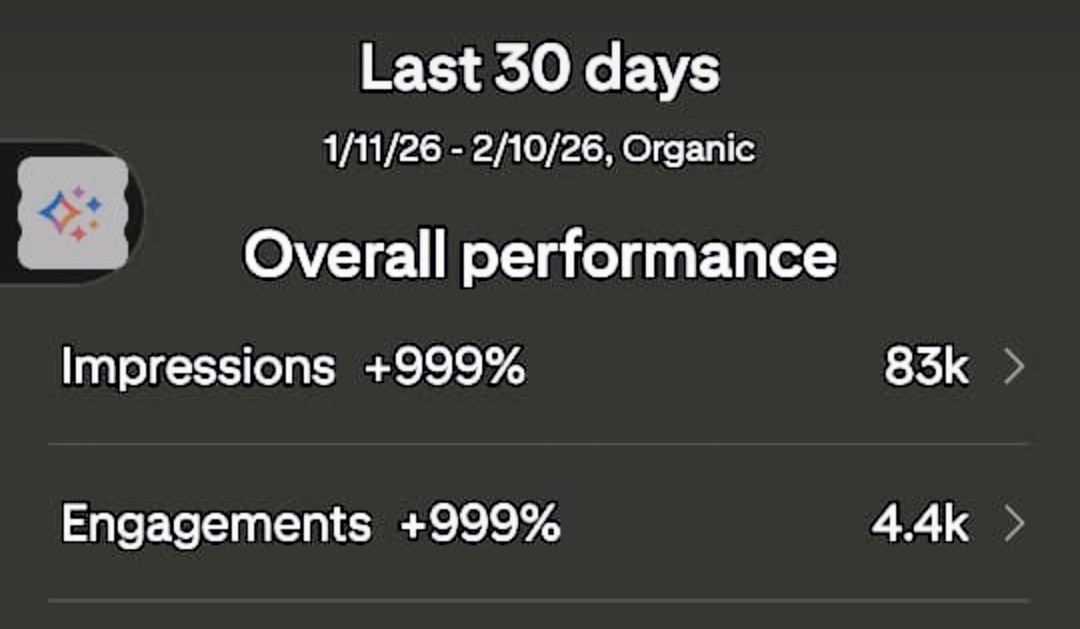 I drove impressions up by 999% to 83k in just 30 days. Engagements exploded by 999% to 4.4k, proving people weren't just scrolling past. The account went from invisible to impossible to ignore. All organic, all intentional, all measurable.