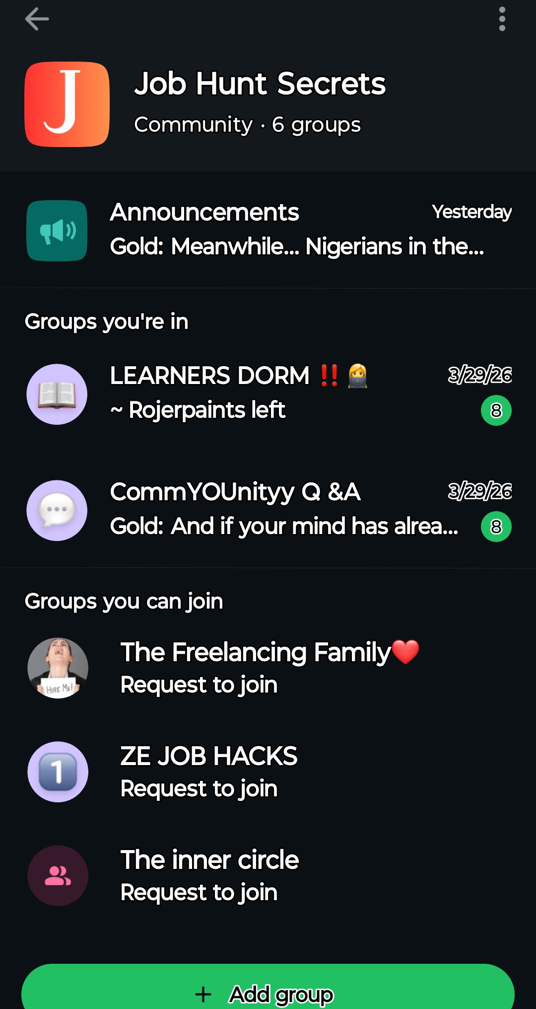 As a Growth strategist , I supported Job Hunt Secrets as a multi-layered community with over 500+ people with purpose-built groups for different needs. Launched LEARNERS DORM for skill building and Community Q&A for peer support. Curated announcements to keep momentum high. Connected people to specialized groups like ZE JOB HACKS and The Freelancing Family so everyone found their tribe.