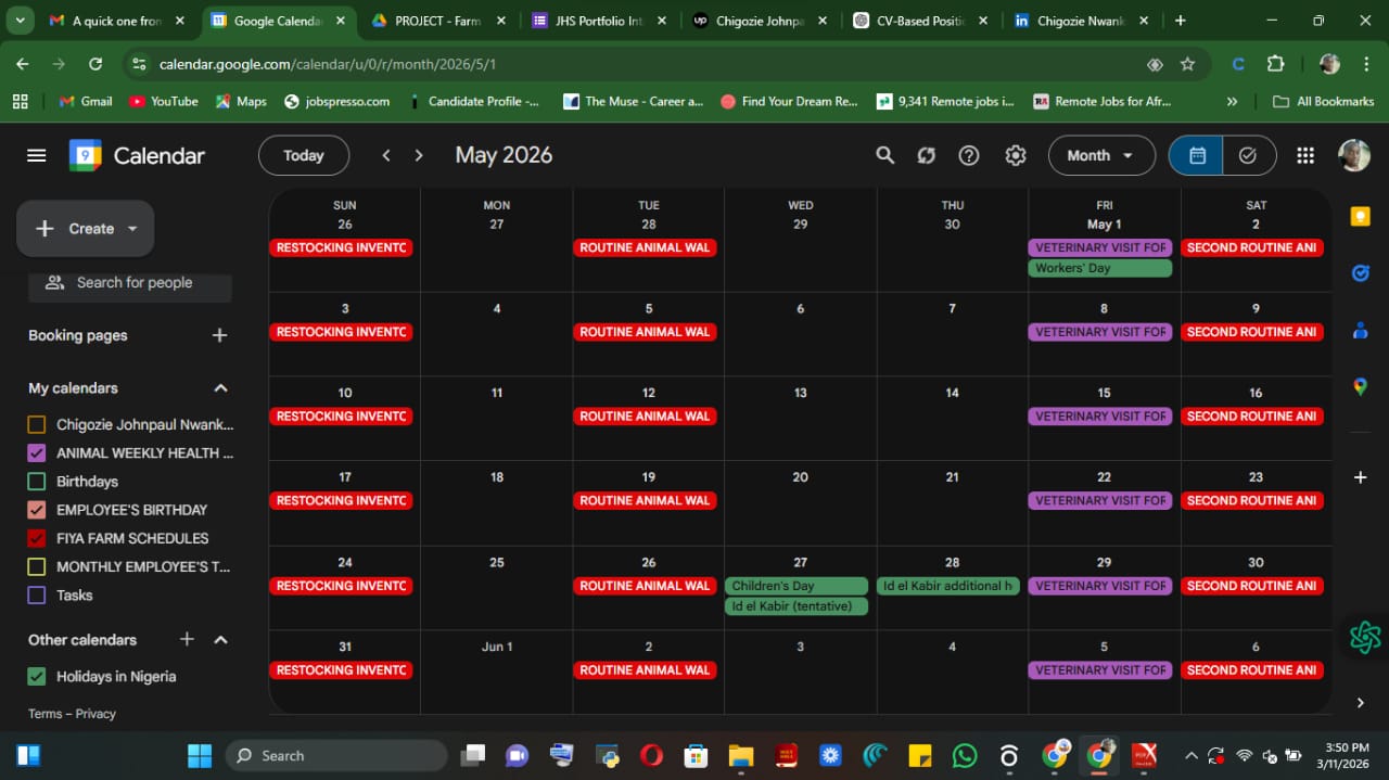 As the Administrator, I designed and implemented a digital calendar system to centralize all farm activities in one place. I mapped out all recurring operational tasks including animal feeding schedules, veterinary appointments, staff birthdays, and monthly training sessions. I then organized these into a structured calendar with reminders and recurring events to ensure consistency. I also categorized activities by type to make the calendar easy to read and manage.